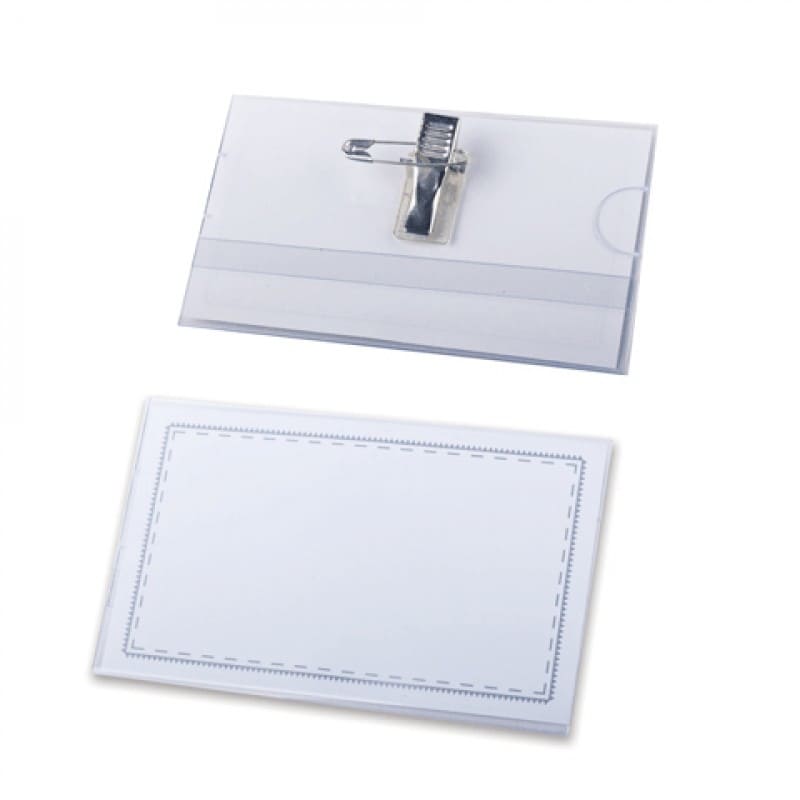 Выполнен из плотного прозрачного пластика, на задней стороне металлический зажим и дополнительное крепление, булавка.