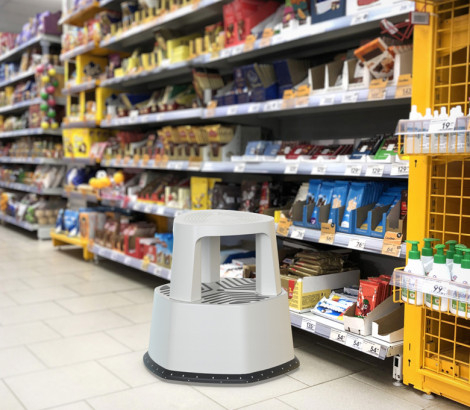 Передвижной табурет-стремянка STEPP PRO позволяет без труда добираться до полок, расположенных выше человеческого роста. Особенности: оснащён колёсиками, с помощью которых табурет легко передвигать, даже если руки заняты имеет резиновую окантовку и вставки, что предотвращает скольжение табурета на полу и скольжение ног на табурете подходит для использования в магазинах, аптеках, на складах, в офисах, а также дома или в гараже. Характеристики: высота: 440 мм максимальная нагрузка: 150 кг вес: 2,8 кг материал: пластик Табурет поставляется в разобранном виде.