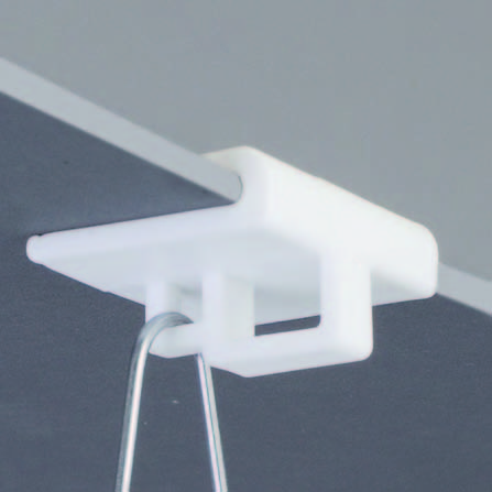 CEILING CLIP — это пластиковая петля-клипса, которая защёлкивается с боковой стороны направляющей стандартного подвесного потолка.