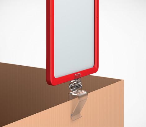 Универсальная клипса-держатель пластиковой рамки с регулируемым углом наклона. Крепится на край коробки или другой тары, полки толщиной до 20 мм. Обеспечивает дискретную регулировку угла наклона рамки в диапазоне 180˚.
