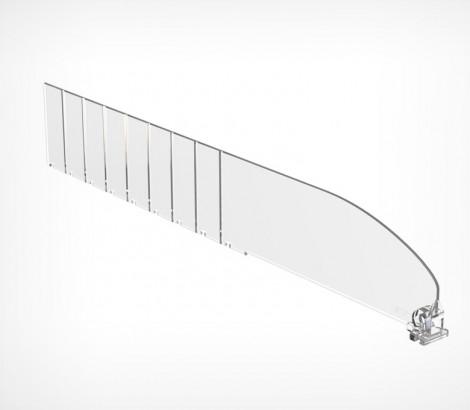 Разделитель DIV60-В выс.60 мм без ограничителя - предназначен для организации выкладки небольших лёгких товаров, таких как сигареты, лекарства, парфюмерия и косметика. материал: прозрачный ударопрочный пластик, имеет насечки с шагом 25 мм для обламывания по длине. Особенности: подходит для полок глубиной 200–400 мм. Задняя часть разделителя разделена на фрагменты, которые можно отрезать, чтобы регулировать длину. Для крепления на полку нужны специальные профили, которые фиксируются на переднюю и заднюю стороны полки. На передней и задней части разделителя есть вырезы (замки) для фиксации на профиль.
