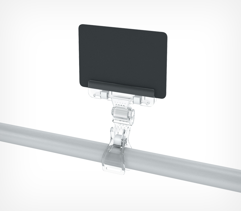 Держатель  легко крепится на товар, край корзины или на трубчатое торговое оборудование (макс. диаметр 32 мм.) Ширина захвата - 80 мм., толщина вставки - до 6 мм. Может использоваться с грифельными табличками, бумажными, картонными, вставками из ПВХ и другими информационными носителями.
