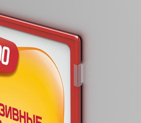 Клипса для крепления рамок к стене или другим ровным поверхностям  под углом 0° или 90°. Клипса крепится к поверхности на вспененный скотч (нанесен на клипсу), размер полоски скотча - 40×9 мм. Для крепления рамки под углом 0° необходимо 3 или 4 клипсы. Количество клипс для крепления рамки  под углом 90° зависит от формата рамки и качества поверхности.