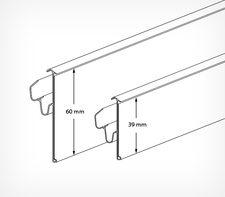 Фиксируется на стеллажах TEGOMETALL, MAGO, РУСЬ и подобных. Возможна установка двух положений наклона ценника к торцу полки. Высота - 39, 52, 60 мм
