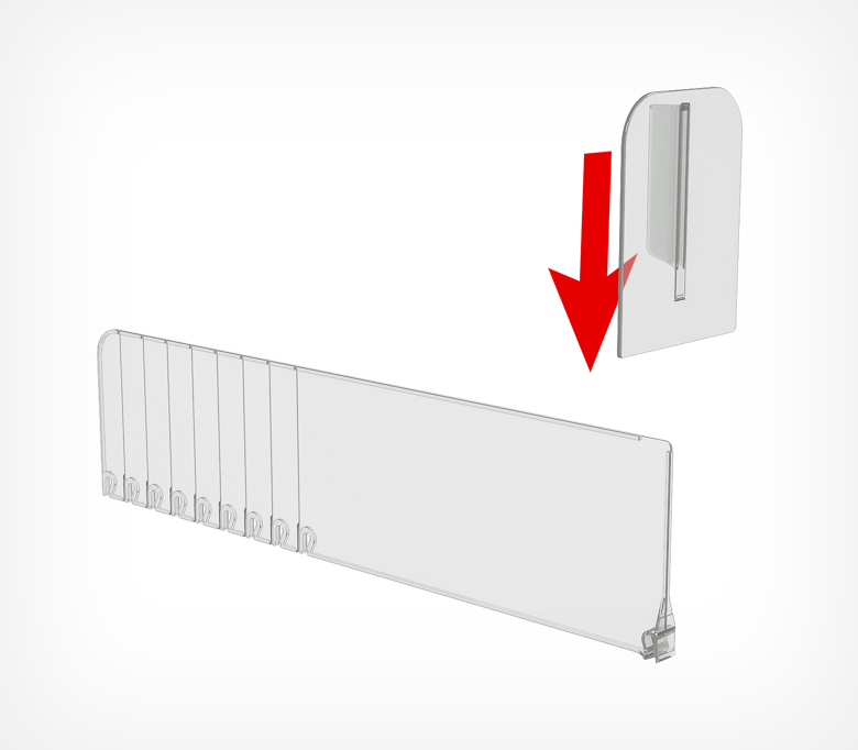 Уникальная модель разделителя с широким съемным передним ограничителем. Позволяет организовать выкладку на полке товаров средних и крупных размеров.
