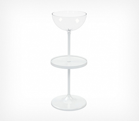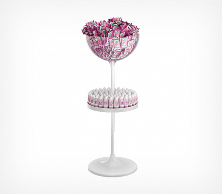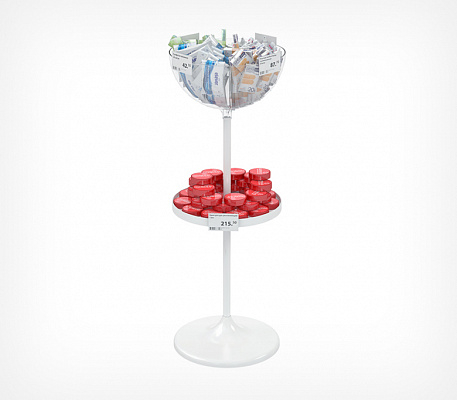 Состав дисплея: пластиковое основание, труба длиной 520 мм, труба — 410 мм, пластиковая полка, пластиковая прозрачная чаша объёмом 24 литра, заглушка, защищающая полость трубы. Габаритные размеры: высота — 1200 мм, диаметр основания — 450 мм. Может использоваться с дополнительными опциями: информационной рамкой, ценниками, разделителями внутреннего пространства чаш, прозрачными бортиками для полки, которые приобретаются отдельно.