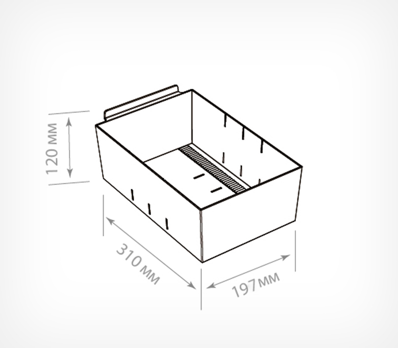 Рифленое дно предотвращает скольжение товара, а прозрачный пластик отлично презентует товар со всех сторон. На лицевой панели могут крепиться самоклеящиеся ценникодержатели. Выдерживает нагрузку до 4 кг.