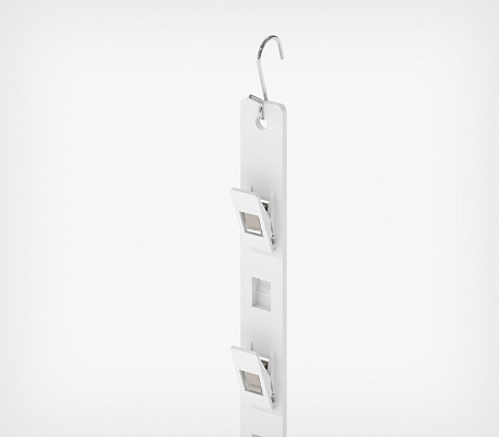 6 пластиковых крючков-фиксаторов расположенных с шагом 63 мм обеспечивают надежное и удобное размещение товаров на ленте. В верхней части ленты предусмотрено отверстие для крепления к топперу или с использованием специального металлического крючка для страйп-лент или хомута.